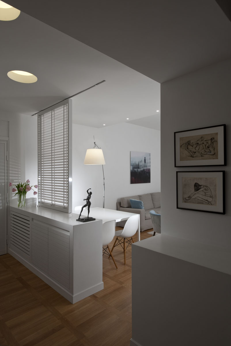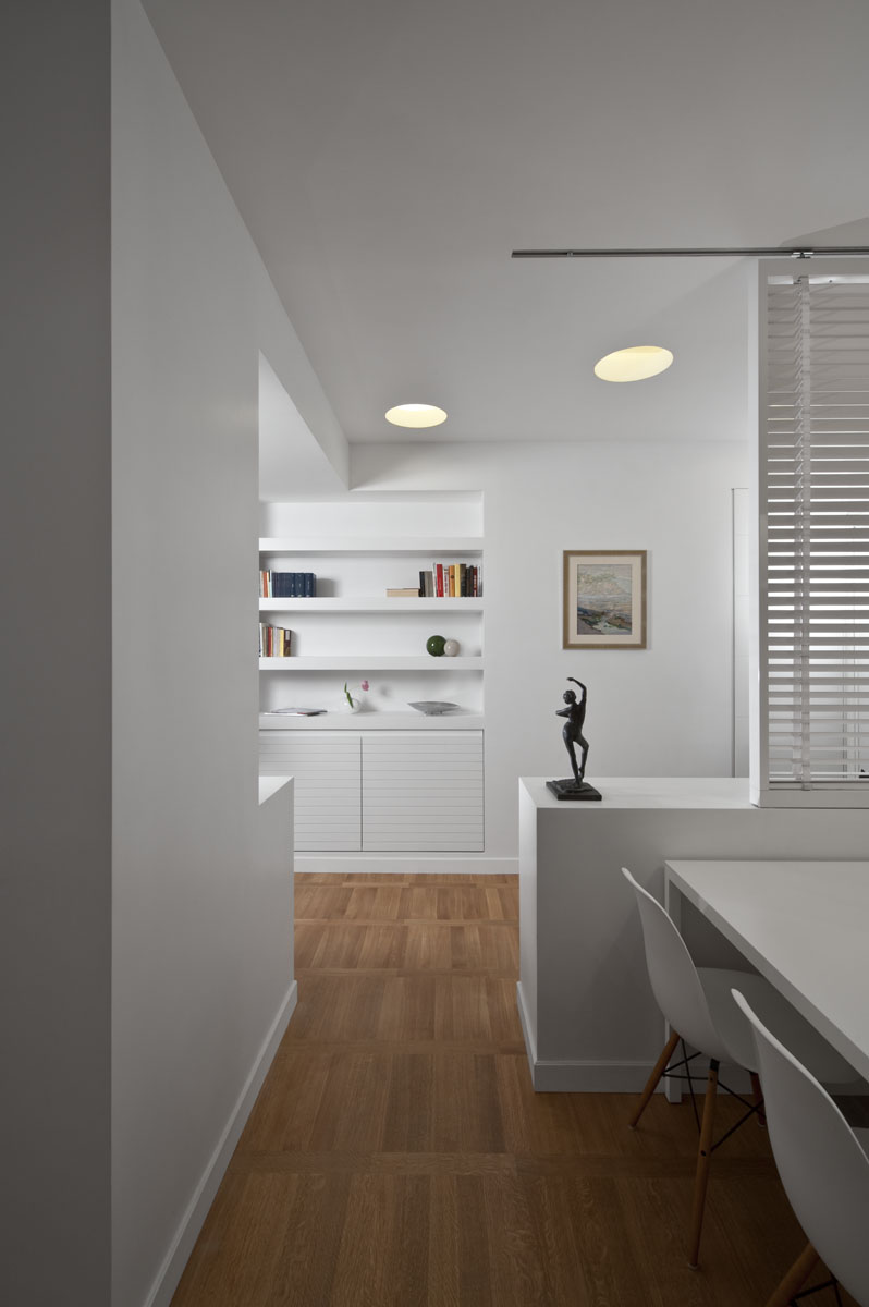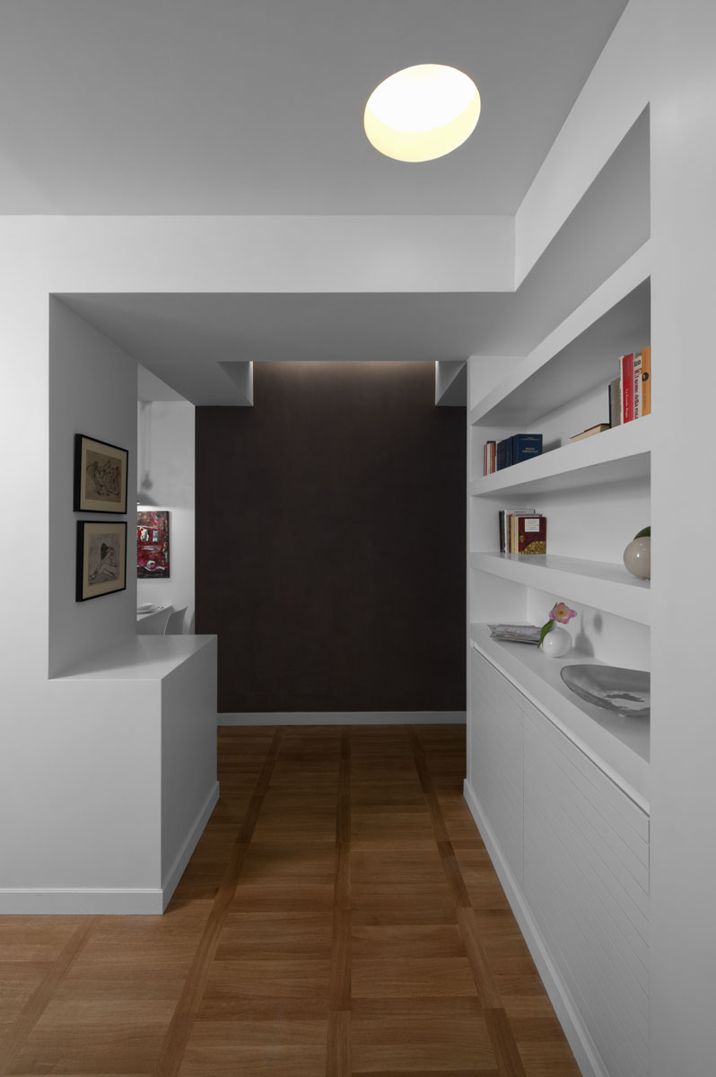 In questo piccolo appartamento in uno stabile della fine degli anni 60, dagli spazi piuttosto angusti e fortemente caratterizzato da un sistema di circolazione rigido, il progetto punta sulla sottrazione degli elementi verticali.