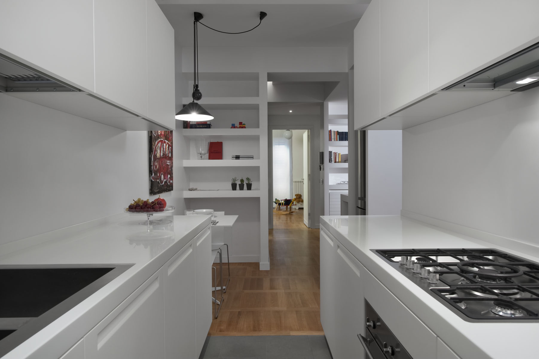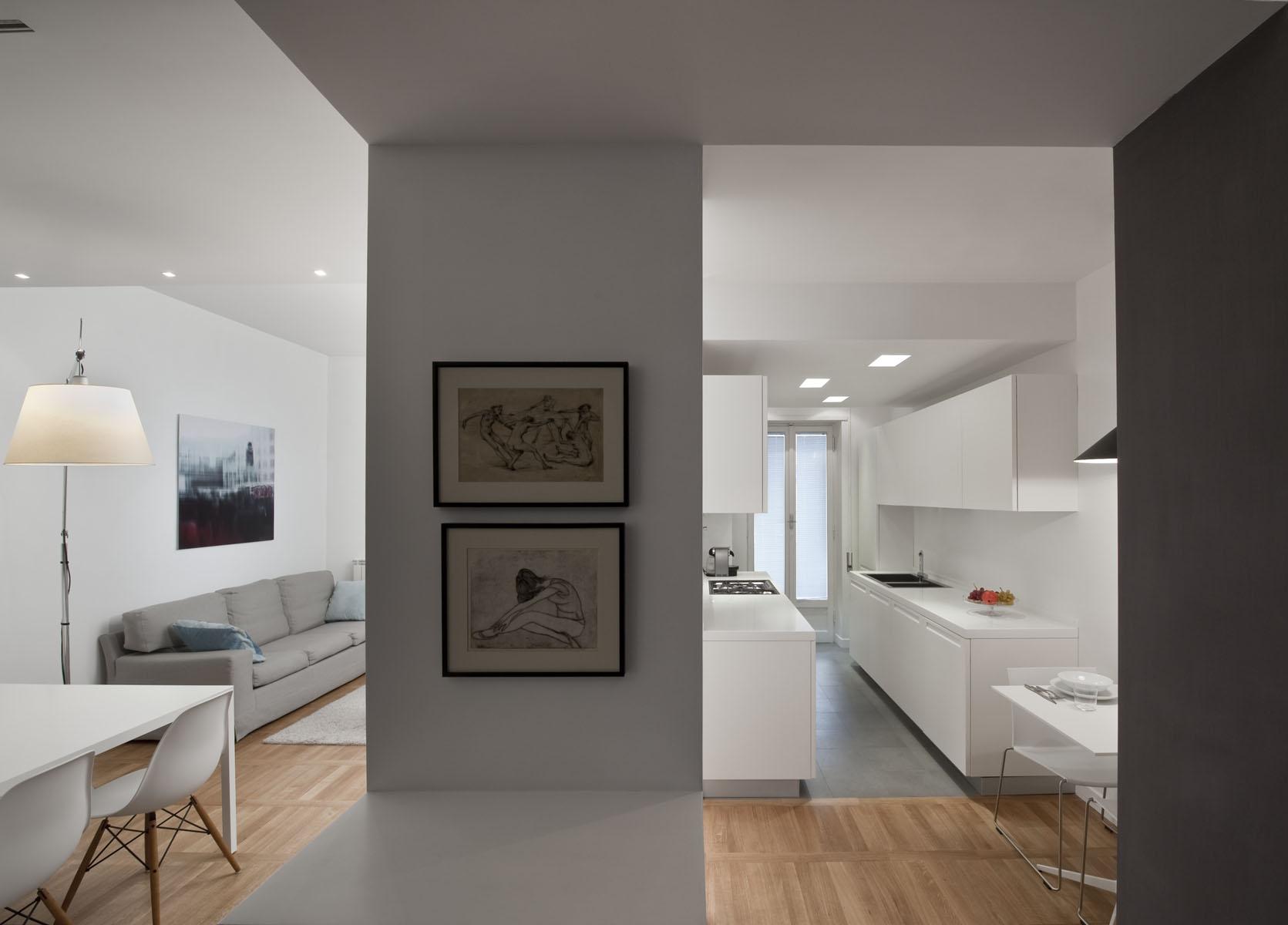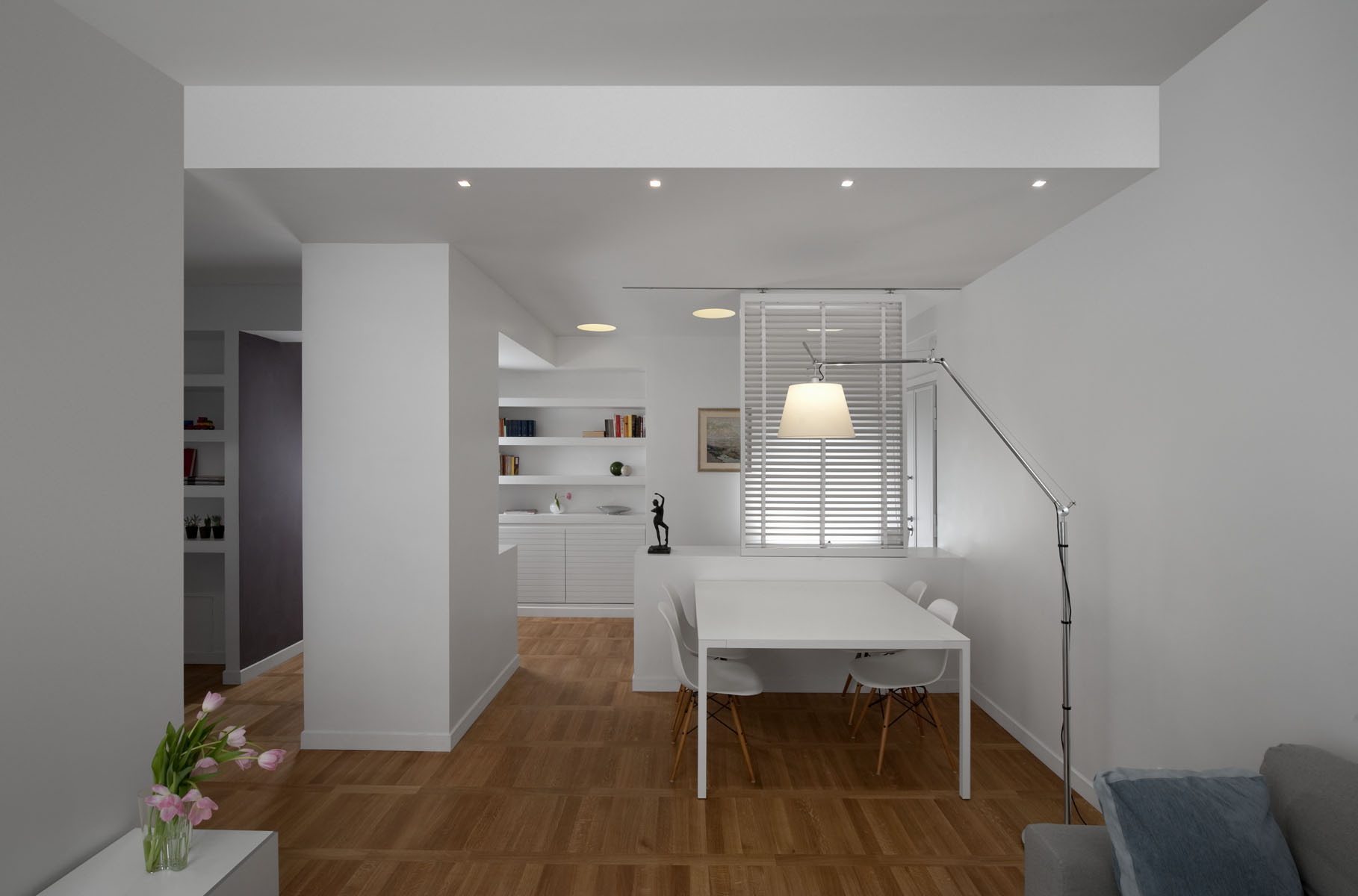 In questo piccolo appartamento in uno stabile della fine degli anni 60, dagli spazi piuttosto angusti e fortemente caratterizzato da un sistema di circolazione rigido, il progetto punta sulla sottrazione degli elementi verticali.