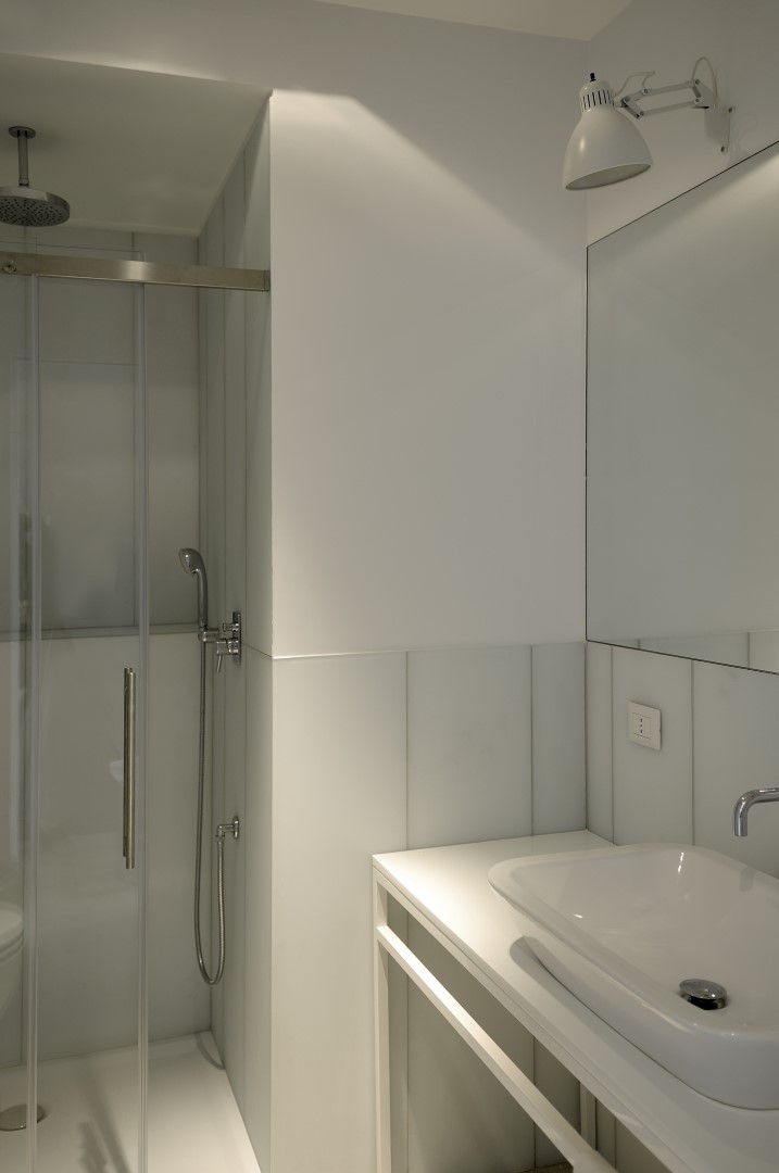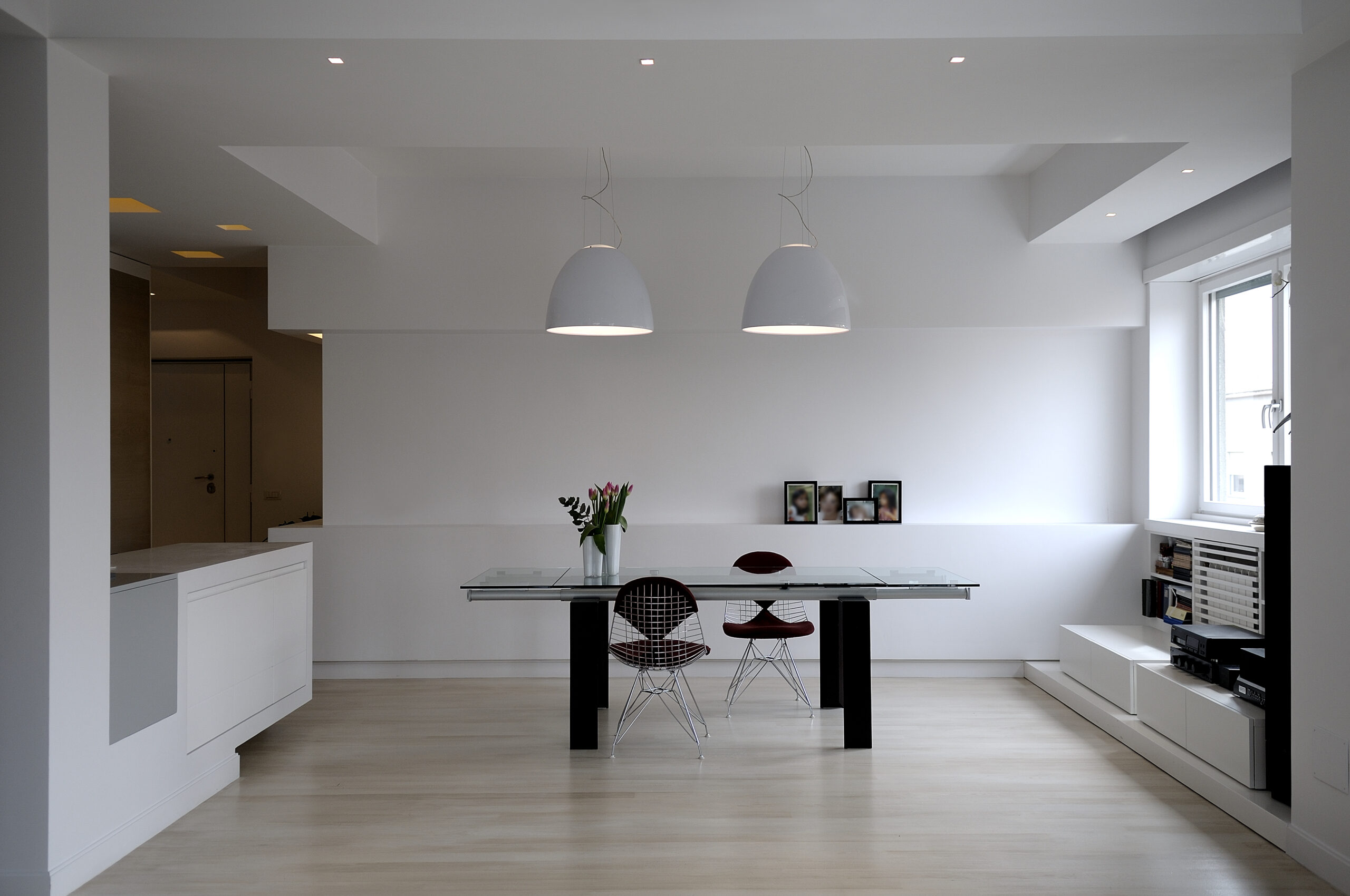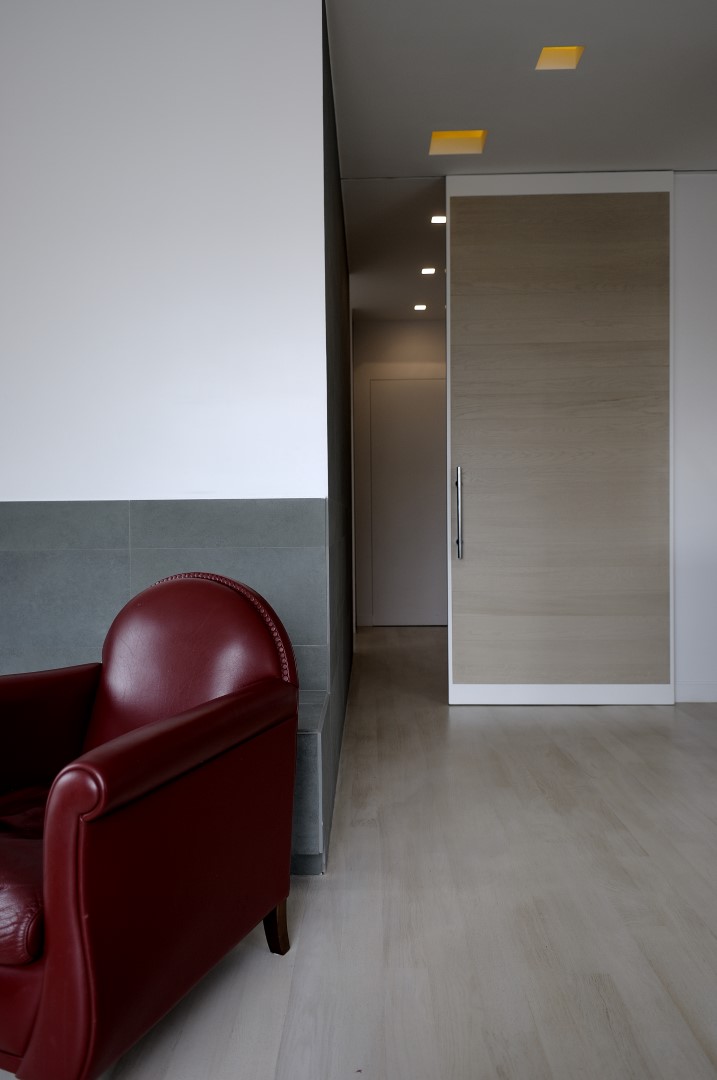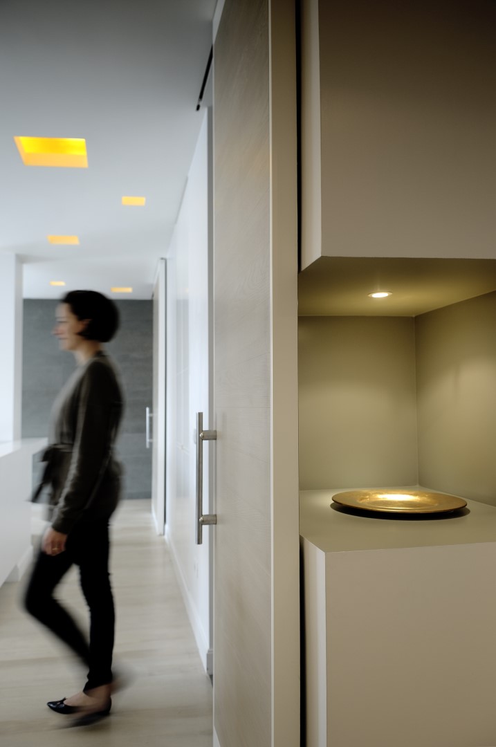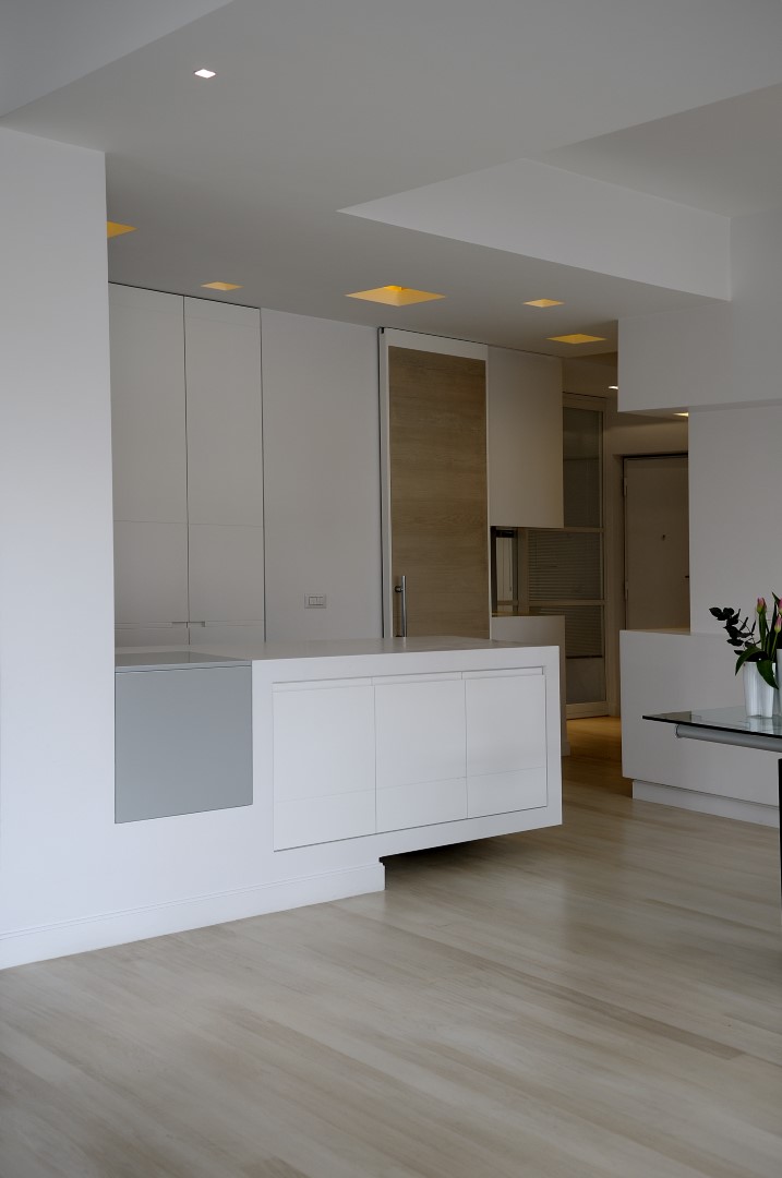 In una palazzina degli anni ’50 un bell’appartamento dalla doppia esposizione, offre scorci luminosi su Monte Mario e la cupola di San Pietro. Il progetto punta a valorizzare la casa senza stravolgerne l’impianto già ben equilibrato, mettendo l’area living in diretta comunicazione con la nuova posizione della cucina attraverso un corridoio i cui confini spaziali restano definiti solo dai controsoffitti.