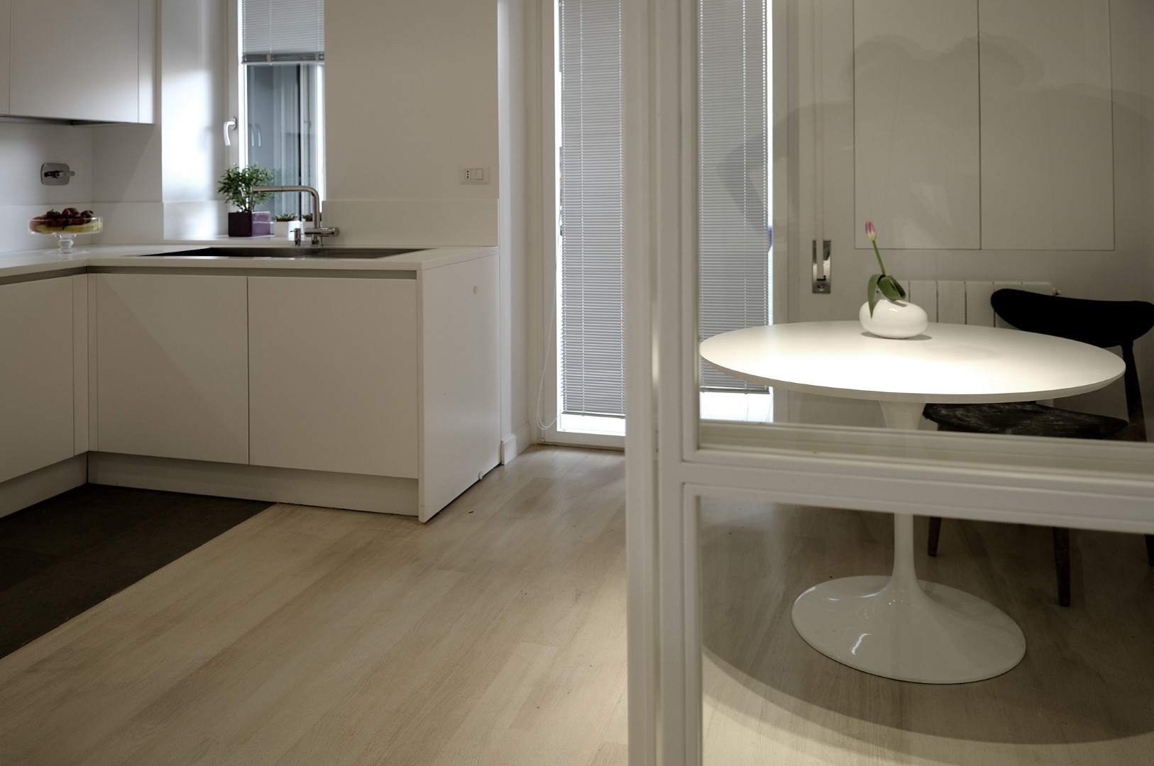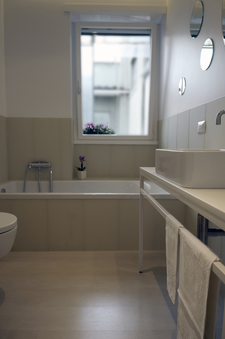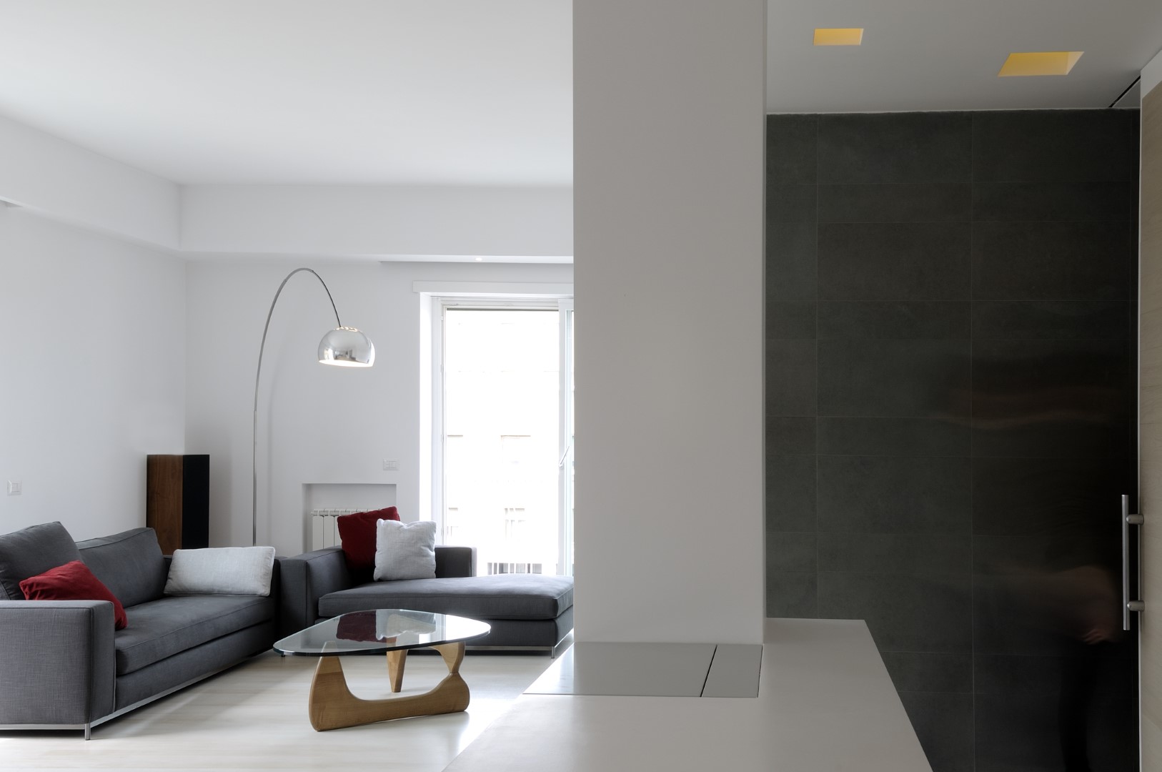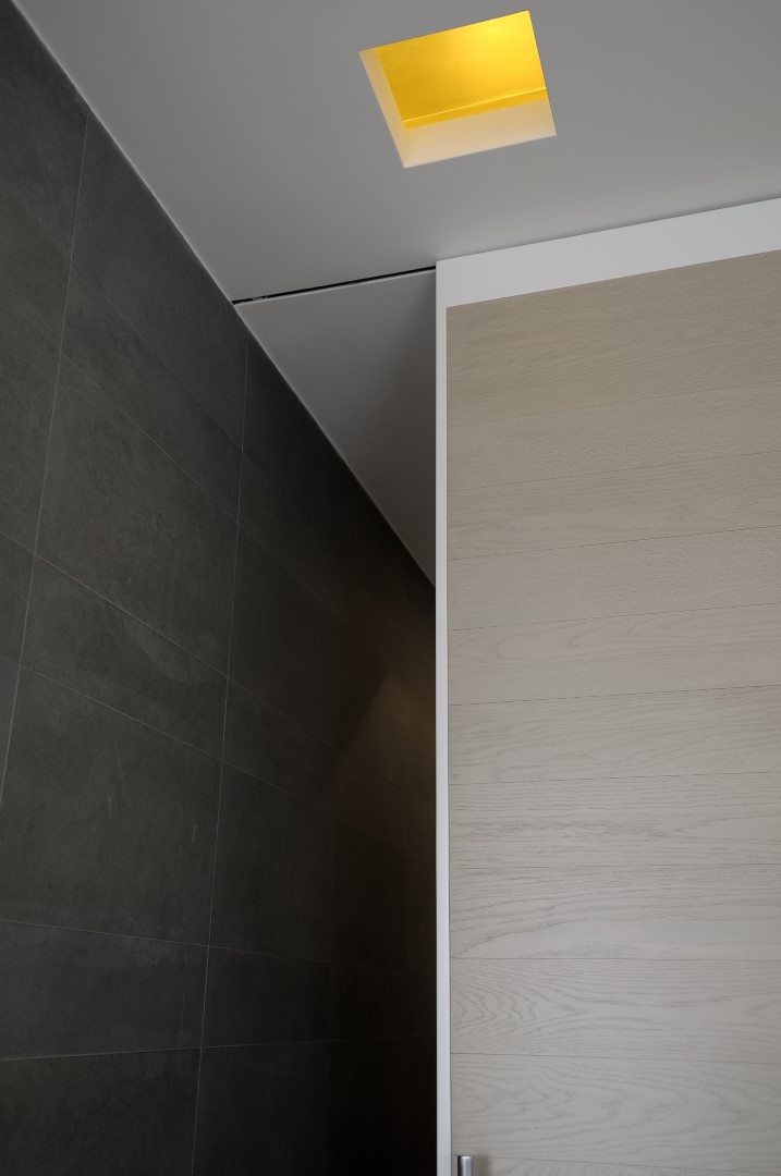 In una palazzina degli anni ’50 un bell’appartamento dalla doppia esposizione, offre scorci luminosi su Monte Mario e la cupola di San Pietro. Il progetto punta a valorizzare la casa senza stravolgerne l’impianto già ben equilibrato, mettendo l’area living in diretta comunicazione con la nuova posizione della cucina attraverso un corridoio i cui confini spaziali restano definiti solo dai controsoffitti.