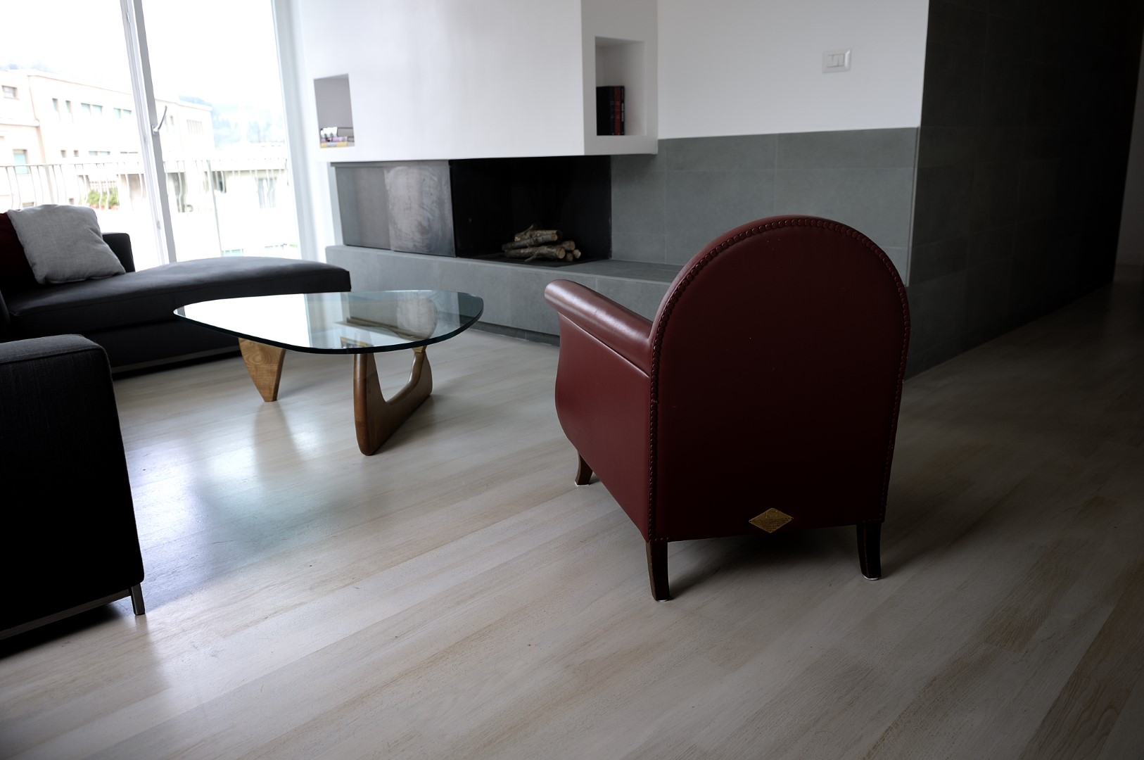 Nella nuova configurazione lo spazio della convivialità è delimitato dalle grandi pareti vetrate e dalle quinte verticali rappresentate dai due pannelli scorrevoli la cui superficie replica la materia della superficie del pavimento.