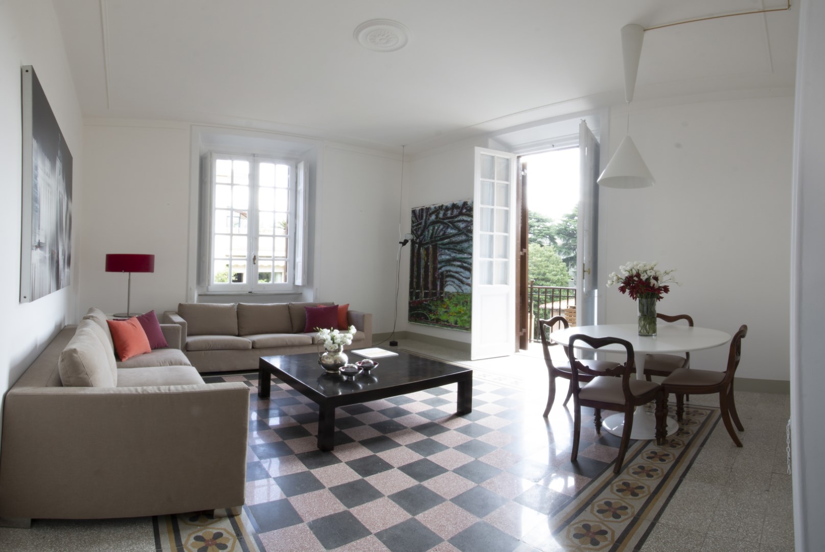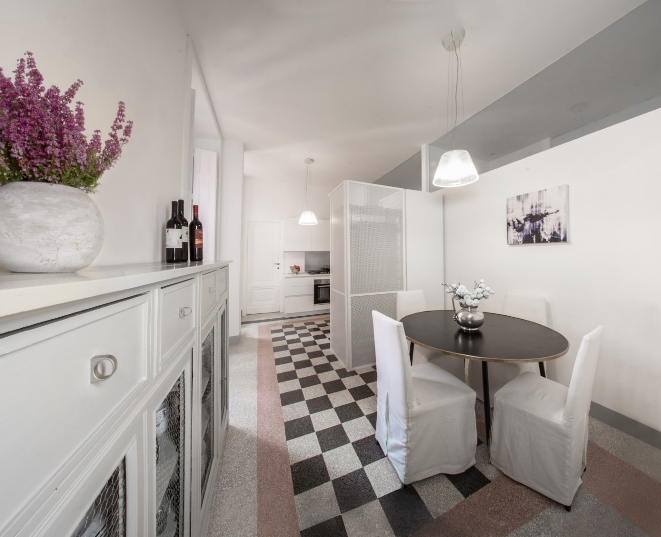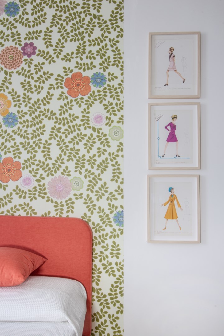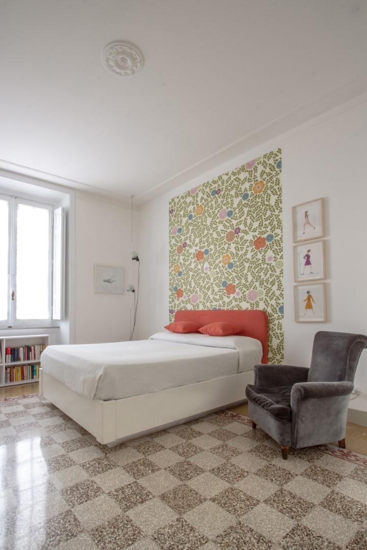 Le magnifiche pavimentazioni di graniglia decorata diventano protagoniste dello spazio, dialogando egregiamente con lo stile austero del mobilio, con le carte da parati e con materiali freddi come il ferro ed il vetro.