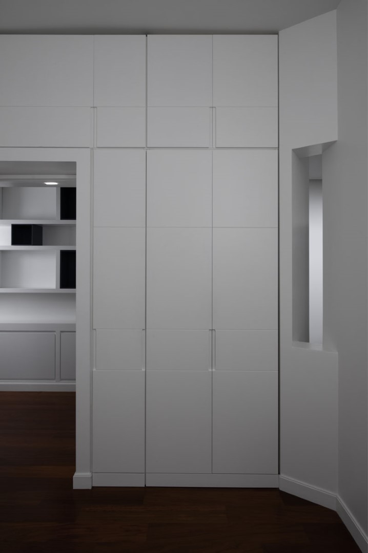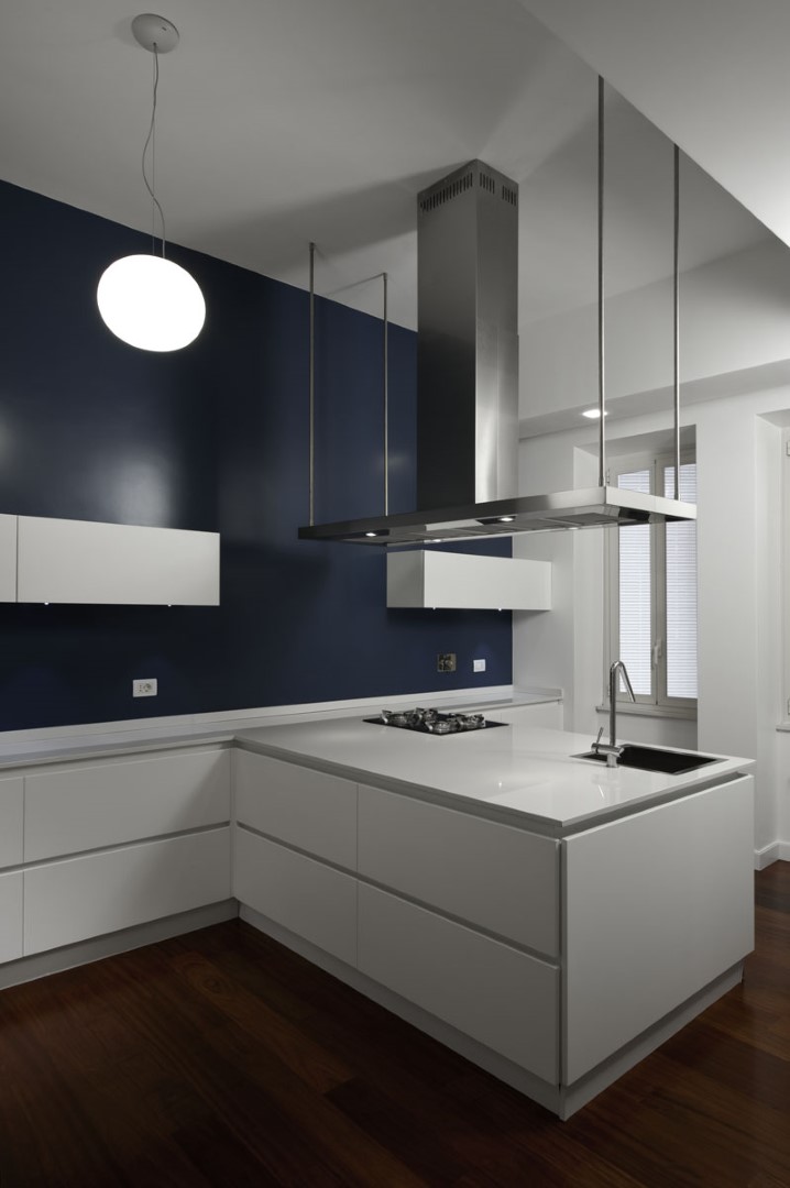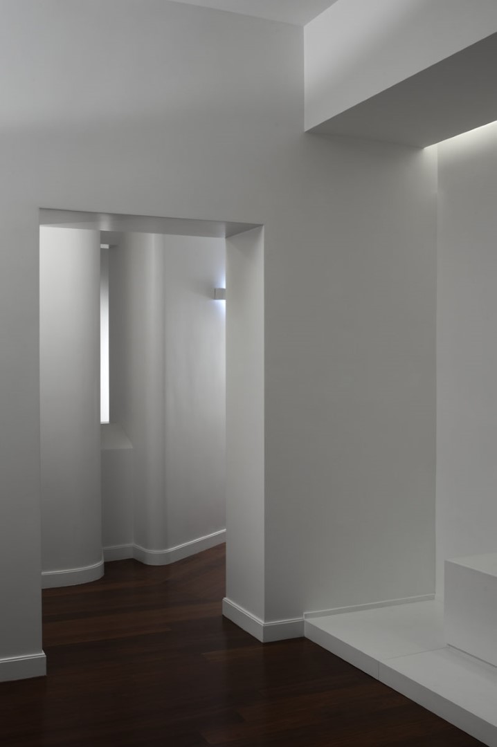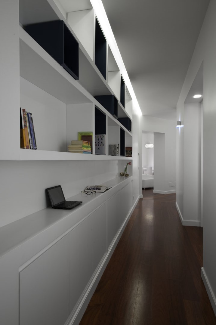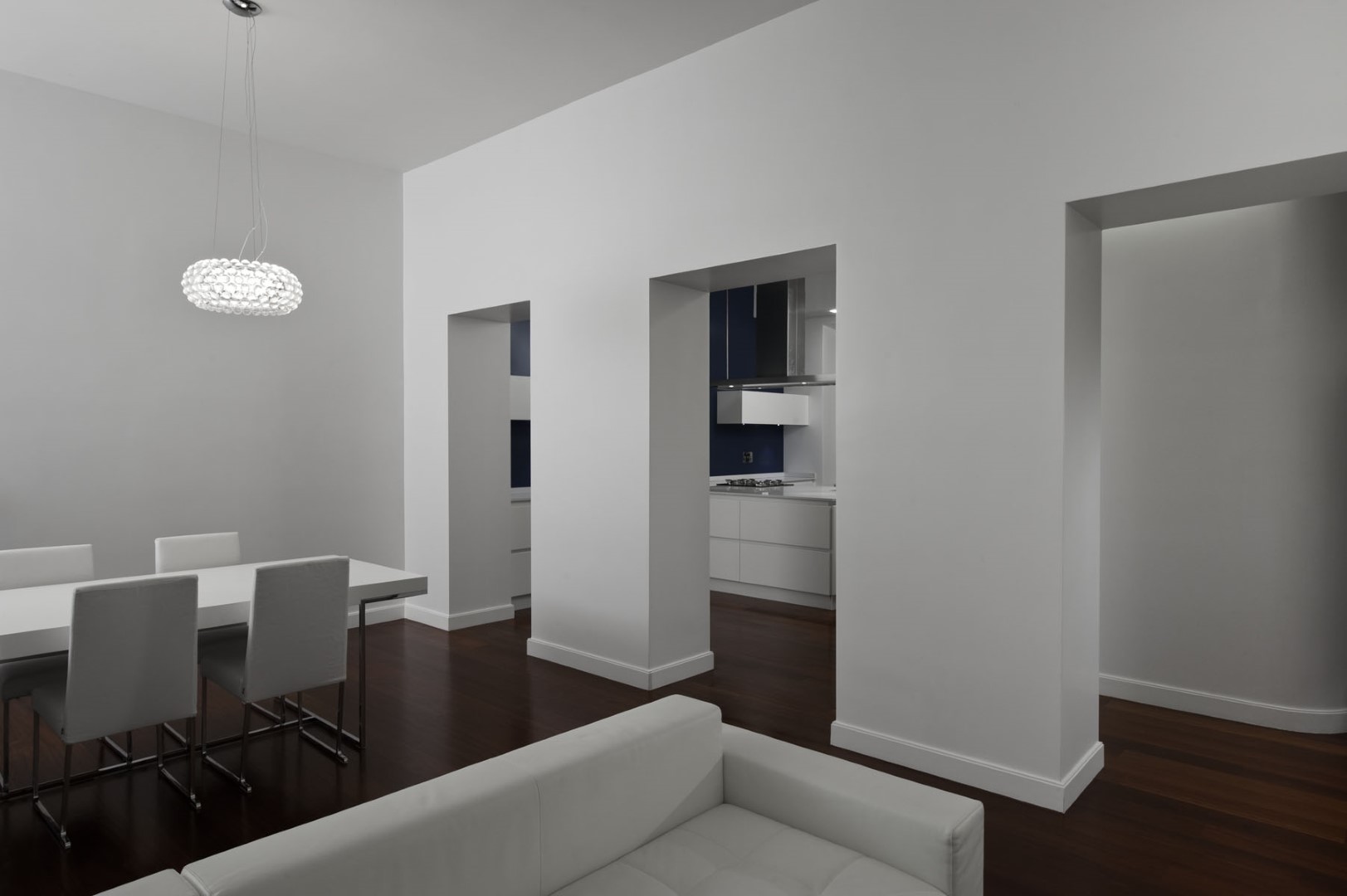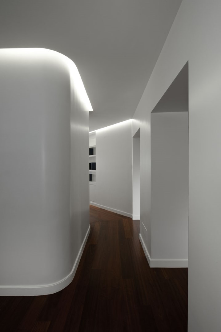Trasformare l’ingresso dell’appartamento sul lungo corridoio in una risorsa, ci è sembrato un’opportunità. Il progetto si sviluppa proprio attorno al punto di innesto del corridoio sulla cucina che diventa così, attraverso tre grandi aperture, un unicum con il soggiorno moltiplicando lo spazio della convivialità. L’arredo quasi per intero realizzato artigianalmente, insieme al rivestimento “sartoriale” delle due stanze da bagno, producono uno spazio organico e raffinato in cui l’illuminazione, naturale ed artificiale, crea emozionanti alternanze di luce ed ombra.