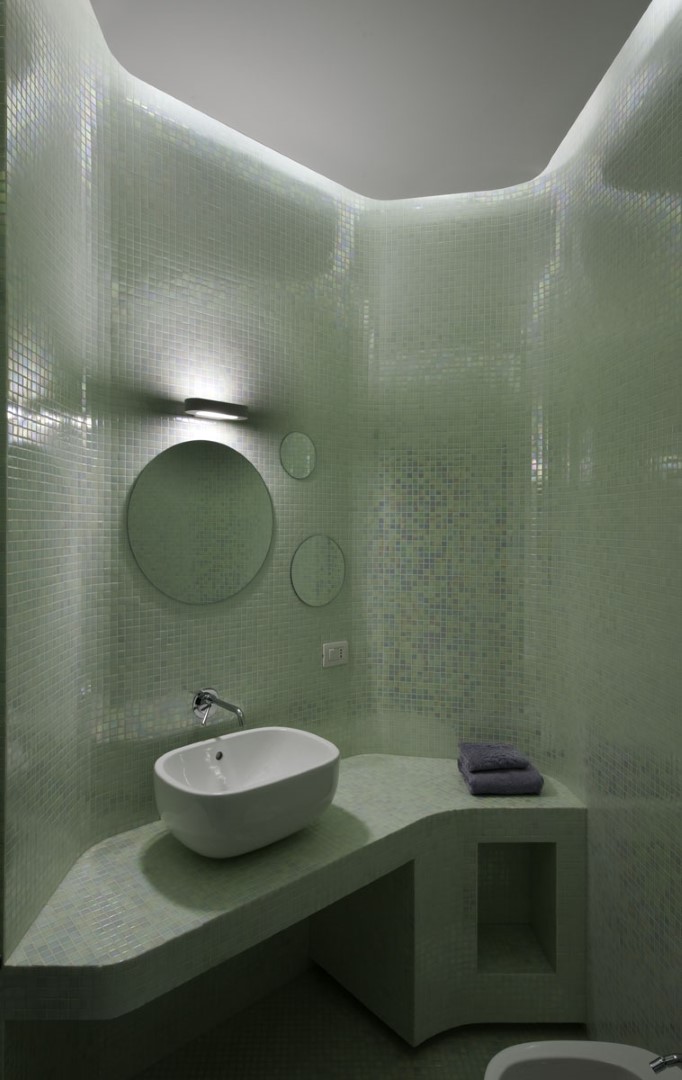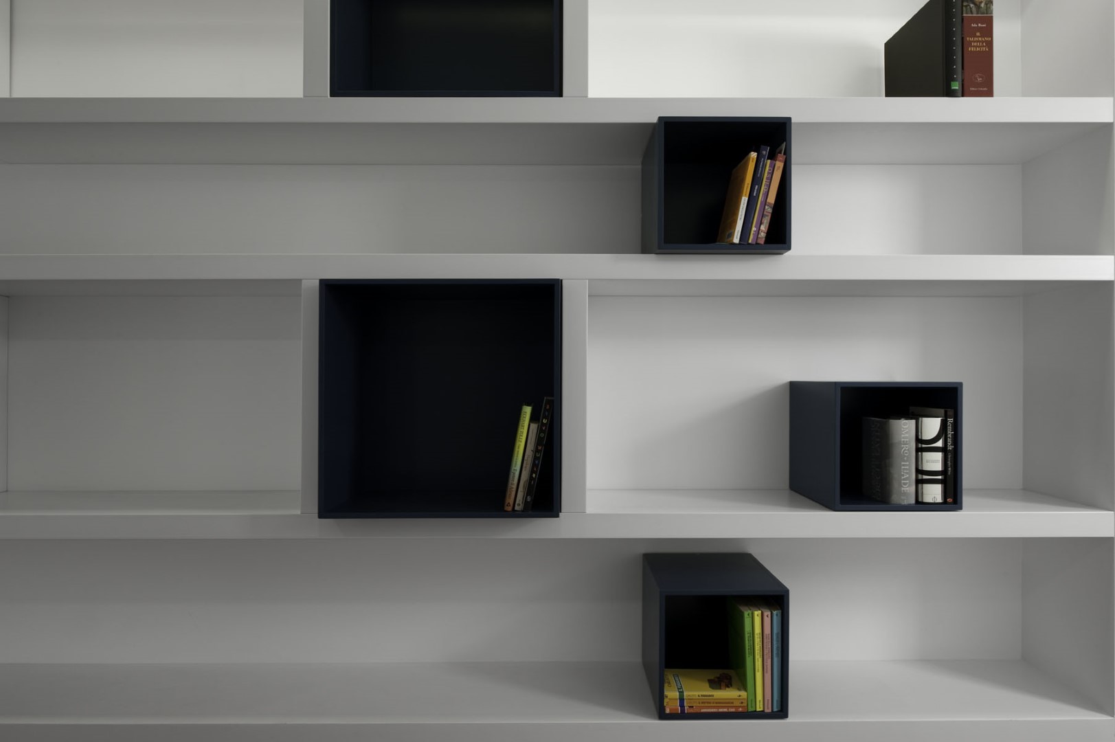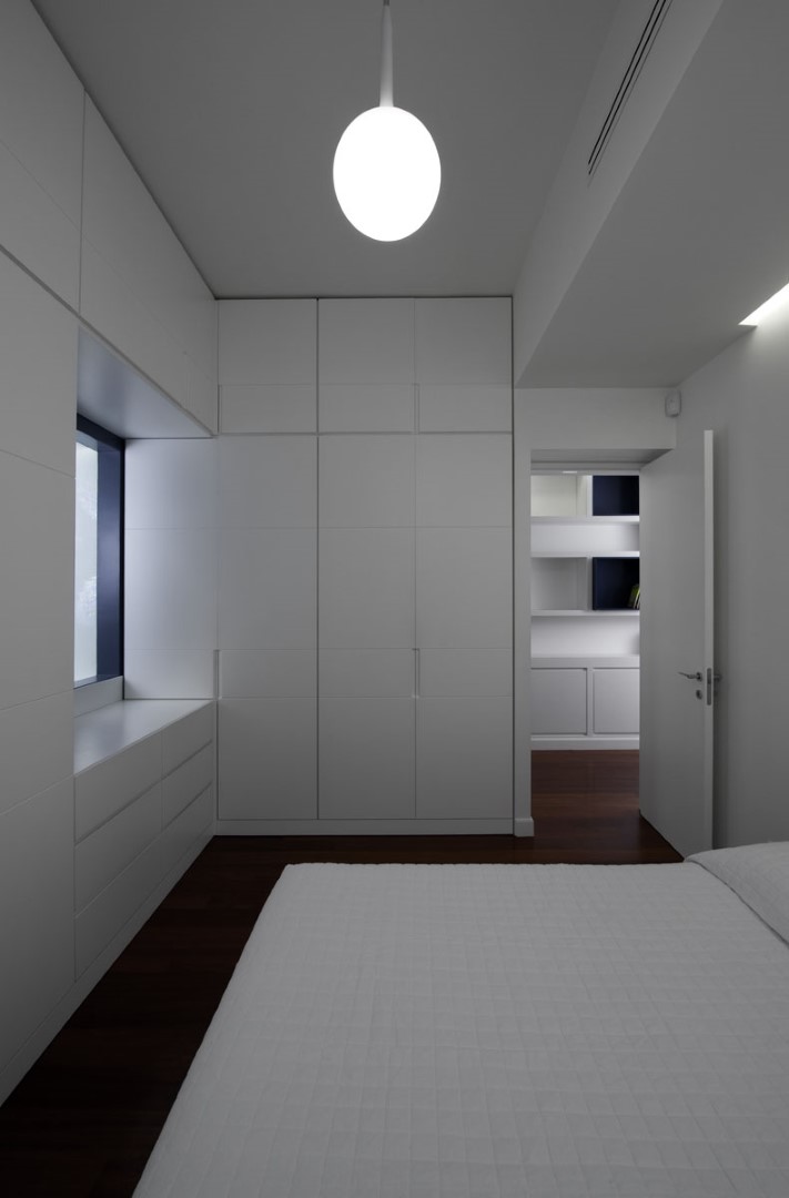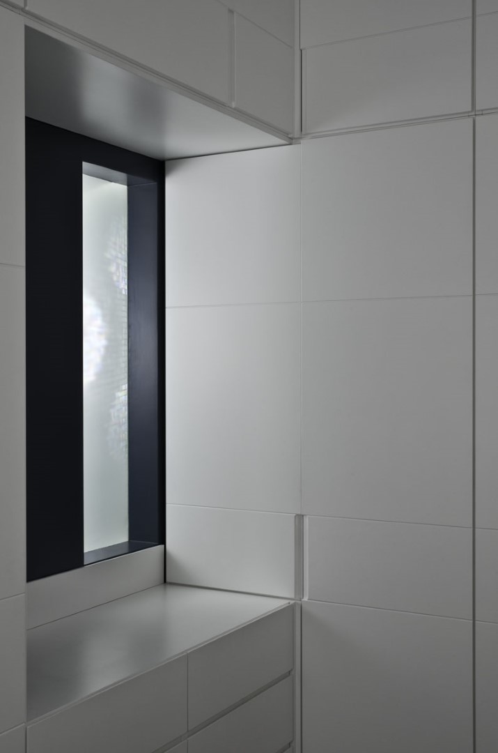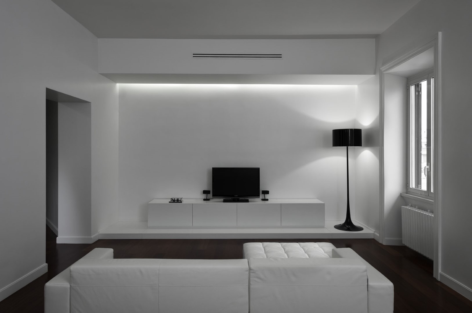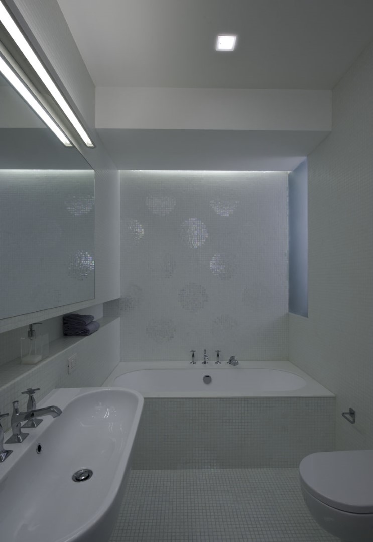 Trasformare l’ingresso dell’appartamento sul lungo corridoio in una risorsa, ci è sembrato un’opportunità. Il progetto si sviluppa proprio attorno al punto di innesto del corridoio sulla cucina che diventa così, attraverso tre grandi aperture, un unicum con il soggiorno moltiplicando lo spazio della convivialità. L’arredo quasi per intero realizzato artigianalmente, insieme al rivestimento “sartoriale” delle due stanze da bagno, producono uno spazio organico e raffinato in cui l’illuminazione, naturale ed artificiale, crea emozionanti alternanze di luce ed ombra.