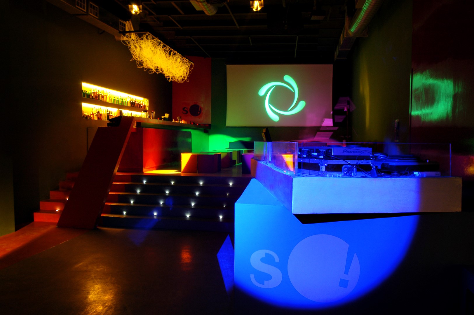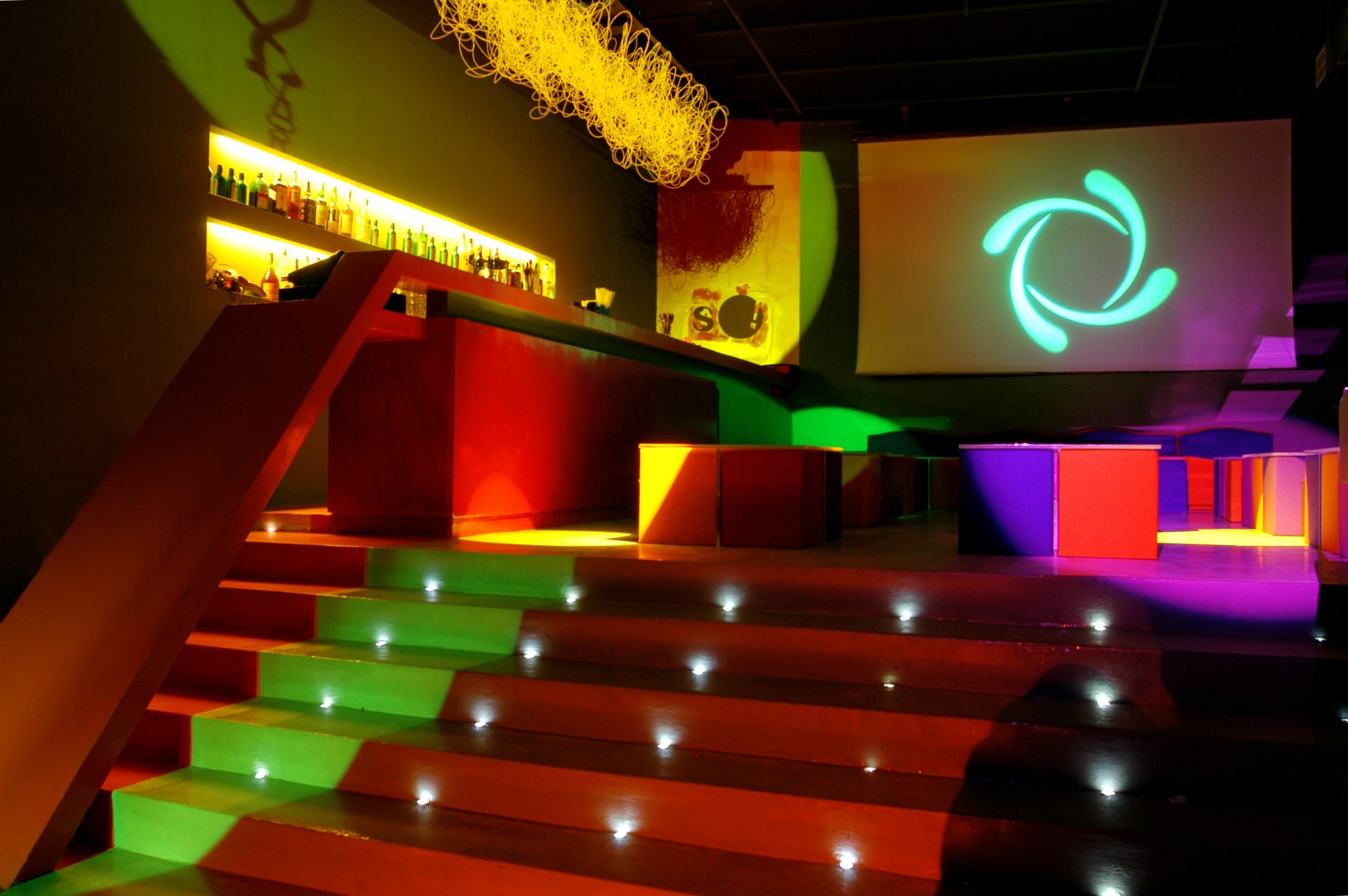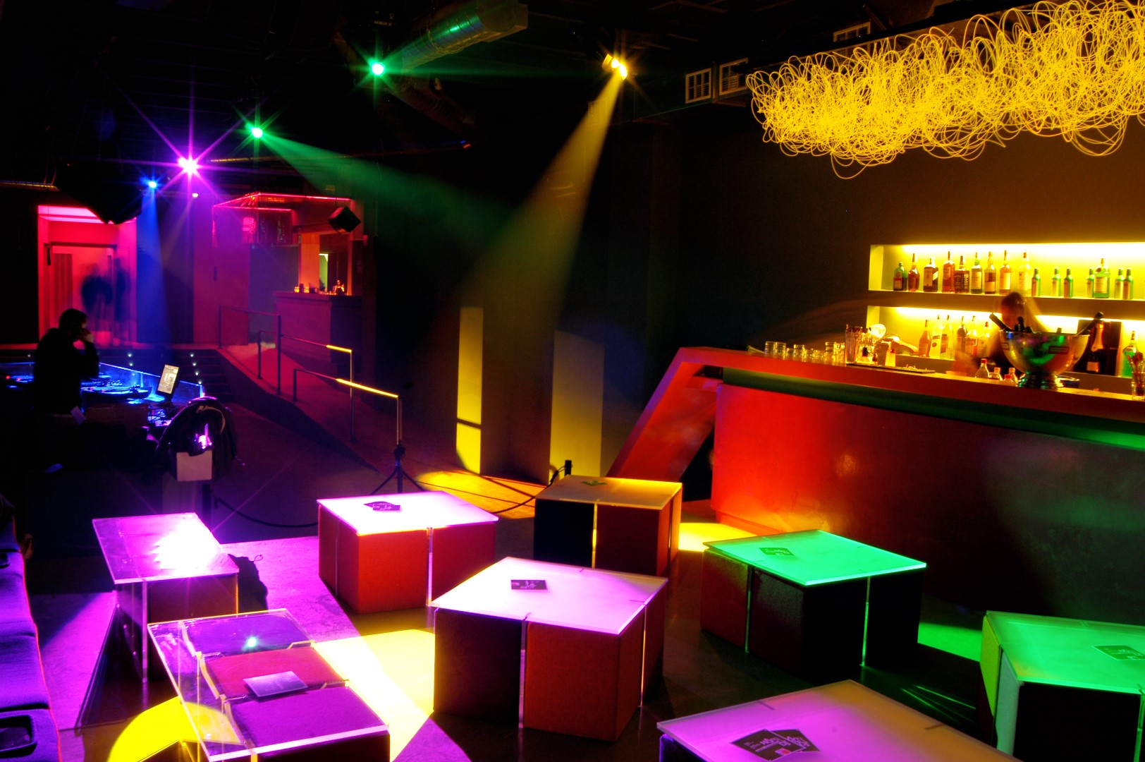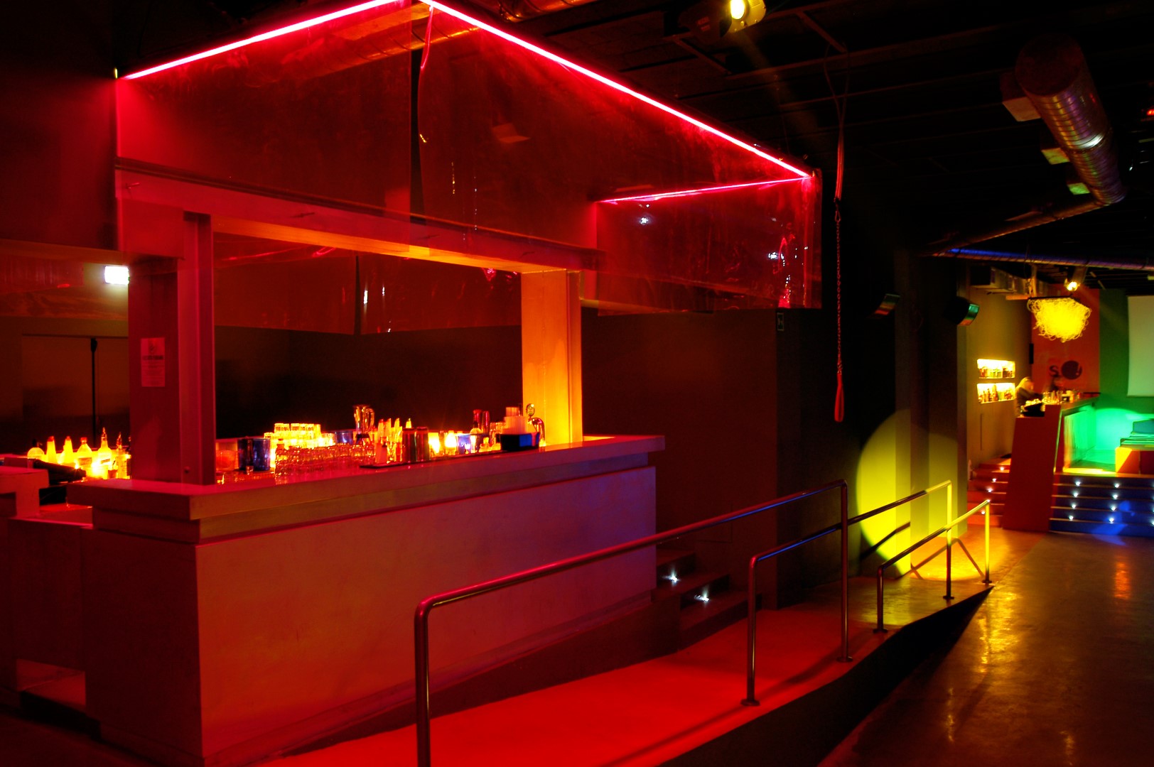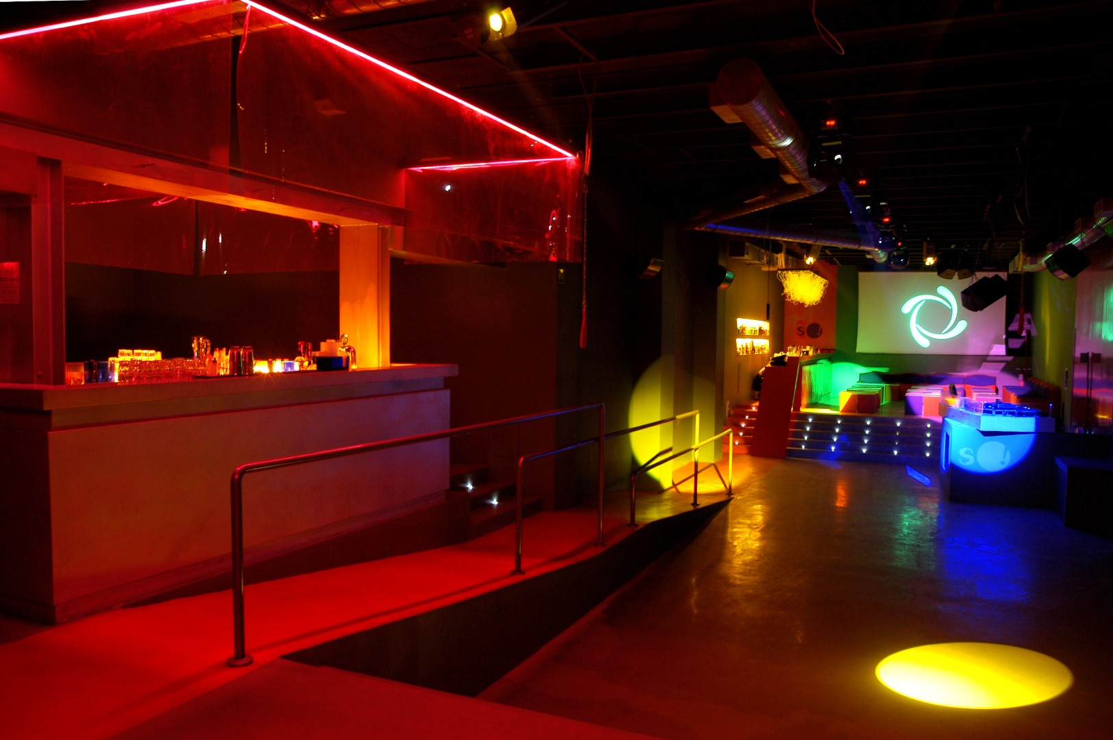 La consolle del deejay e i due spazi bar diventano le sole emergenze architettoniche in un ambiente unico che si sviluppa longitudinalmente lasciando ampio spazio alla zona consumazione delle bevande e alla pista da ballo.