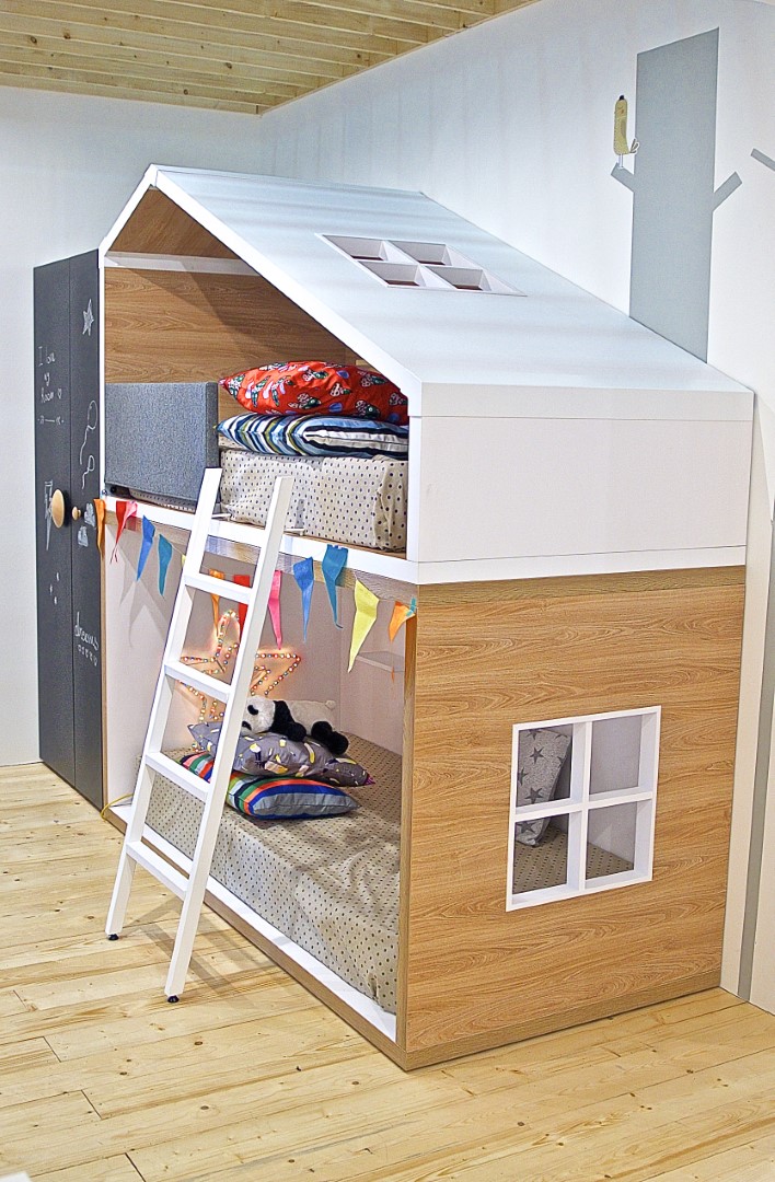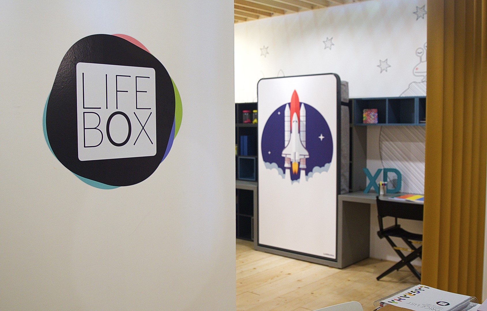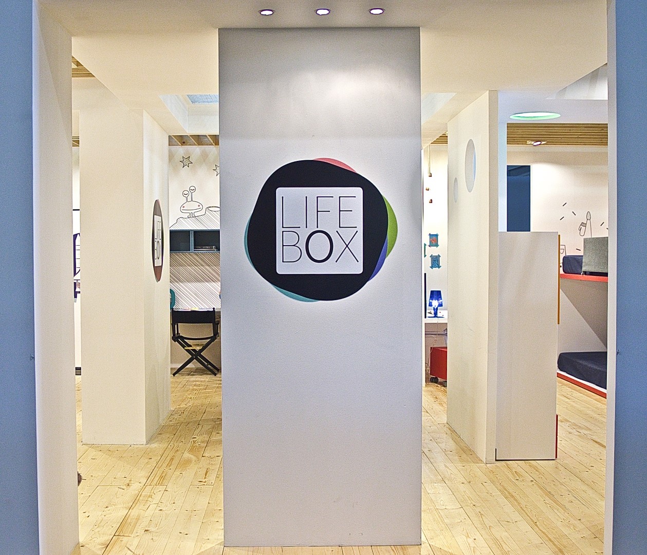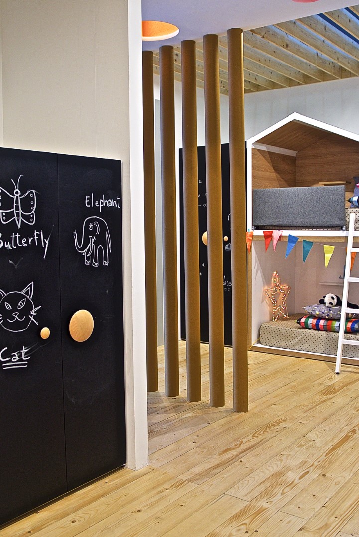 4 micro-cosmi per bambini realizzati per presentare la nuova collezione dell’azienda, occupano uno stand a pianta quadrata dove l’uso di legno di faggio e cartone strutturale lascia ampio spazio alla meraviglia di un percorso di fantasia fatto di oggetti speciali, colore e luce.